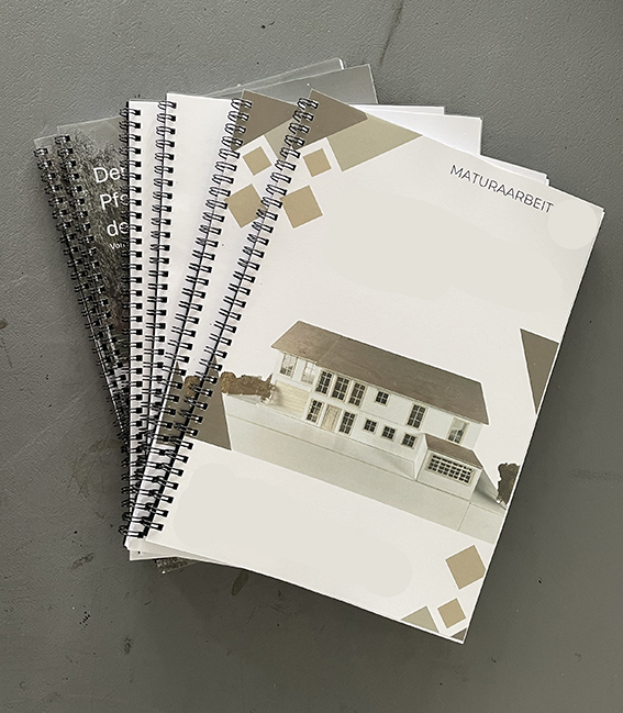Ihre Maturaarbeit/Diplomarbeit/Dissertation/Abschlussarbeit wird auf seidenmattes, 90 g/m2 Papier in Farbe gedruckt. Gebunden wird ihre Maturaarbeit/Diplomarbeit/Dissertation/Abschlussarbeit mit einer durchsichtigen Folie als Deckblatt und einem 500 g/m2 schweren schwarzen Presspankarton als stabilen Rücken in eine schwarze Drahtbindung (Wirobindung).